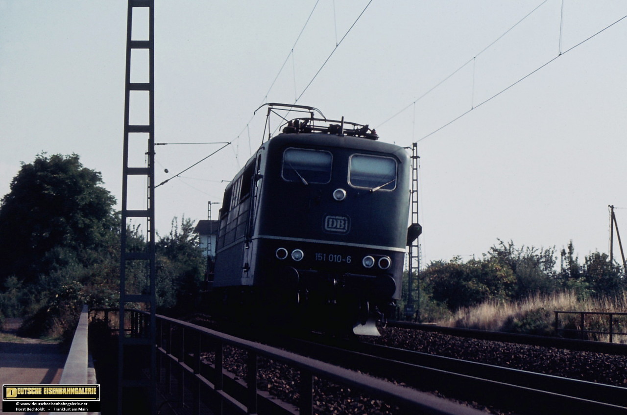 151 010 - 6 überfährt gerade die A 661 Richtung Frankfurt am Main - Aufnahme in F - Eschersheim